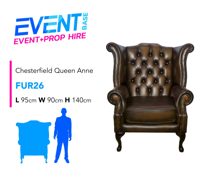Description: Make a statement with this design classic. Introducing our antique brown Chesterfield Queen Anne Armchair is a design classic and is very popular to hire for corporate parties, events, conferences and hospitality events. With traditional buttoned backrests and studded edges, this sofa is perfect for events that call for a classic, relaxed style.