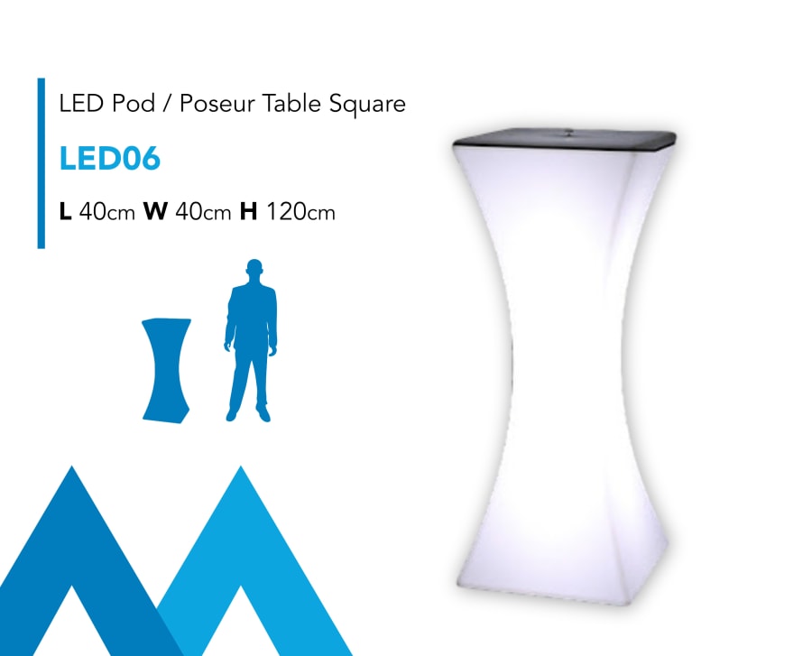 Description: Our LED Event Furniture Hire is hugely popular and makes a statement at any night time event. These colour changing Poseur / Pod tables are perfect for any drinks reception or on the verge of any dance floor or main function space. These tables have a stylish shape that illuminate with a sleek glass top.