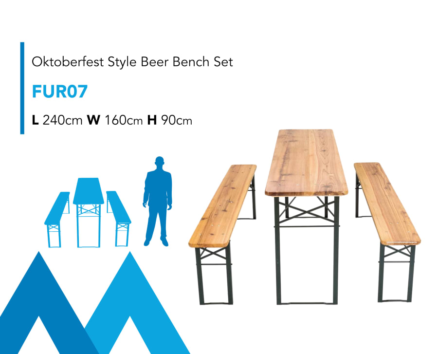 Description: These wooden German Market / Oktoberfest style Beer bench & trestle sets are an ideal dining solution for events, weddings and parties. Suitable for indoor or outdoor use. Contact our team today to get planning your next event! Our picnic bench sets are available to rent Nationwide.