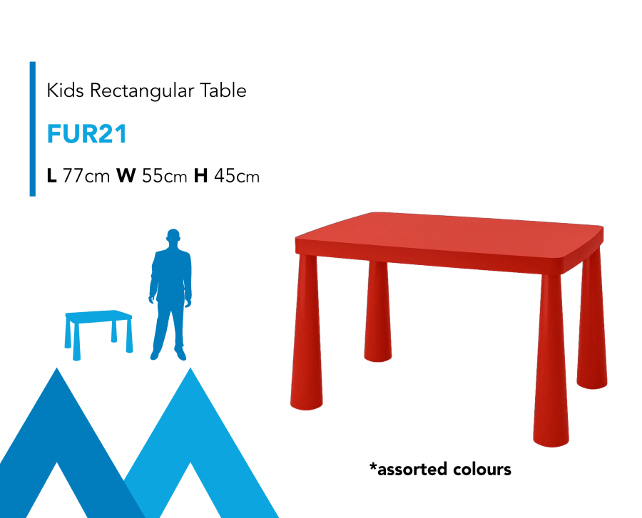 Description: Introducing our fun Kids rectangular tables available for Hire. These indoor or outdoor furniture hire sets are really cute, are loved by children and admired by adults! The look great as part of any Event or Party theme due to their neutral coloured design! Contact us for further information. Long and short-term hire available. Check out our range of other fun event furnishings, props and event essentials. EventBase are your one stop shop for all your event and party needs!