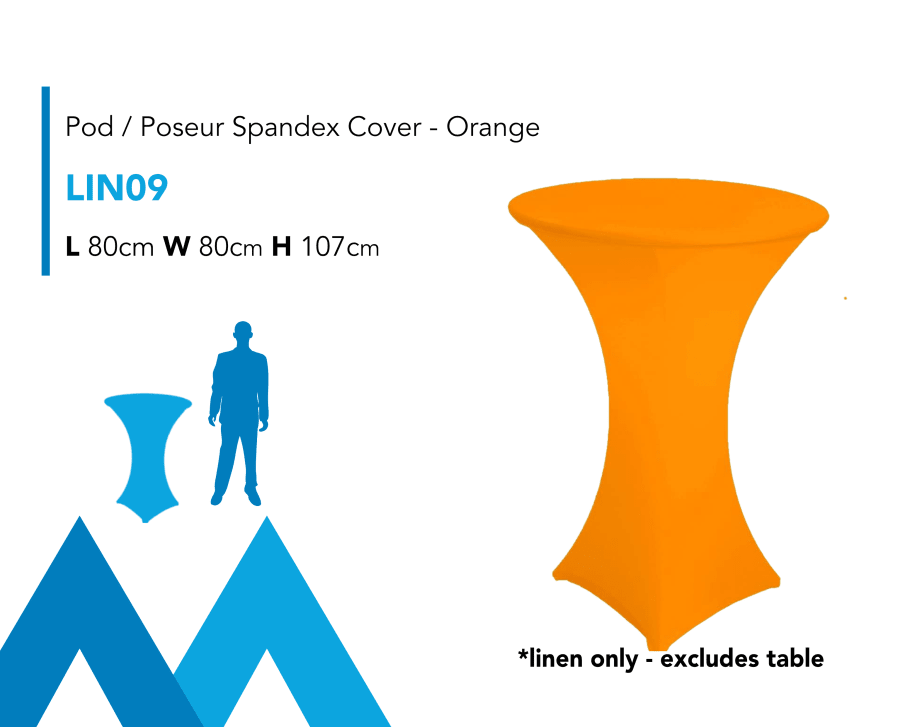 Description: Pod / Poseur Spandex Linen Cove Hire, compatible with our Pod Tables and available in an assortment of colours.