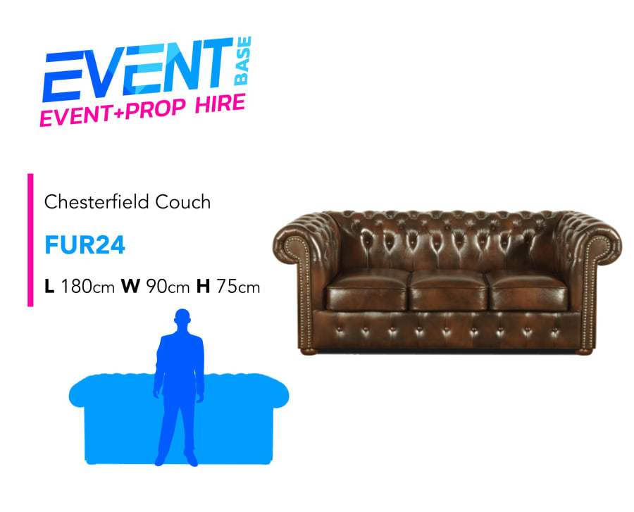 Description: Make a statement with this design classic. Introducing our antique brown chesterfield sofa is a design classic and is very popular to hire for corporate parties, events, conferences and hospitality events. With traditional buttoned backrests and studded edges, this sofa is perfect for events that call for a classic, relaxed style.
