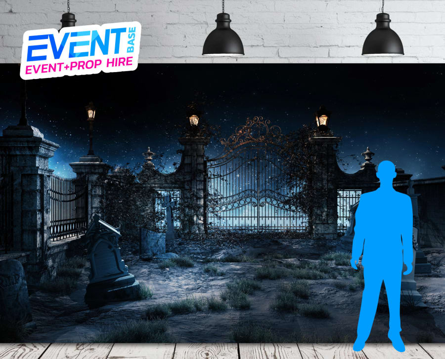 Description: Create a Spooky Haunted House or Graveyard scene at your event by hiring one of our Haunted Graveyard Wall backdrops / scene setters. Cut down on decorating costs and create a much better effect with one of these products. These large screens are self supporting and are usually placed as wall coverings or self-standing units to form a realistic themed effect. Our backdrops are digitally printed on high anti-wrinkle fabric material providing a flawless effect and are installed on a Pipe & Drape framework (included). They are mainly used to form a Backdrop to Event Displays, for Photo Opportunities, Parties, Corporate Events & to decorate rooms, banquet halls. Custom designs also available, call us to discuss your requirements.