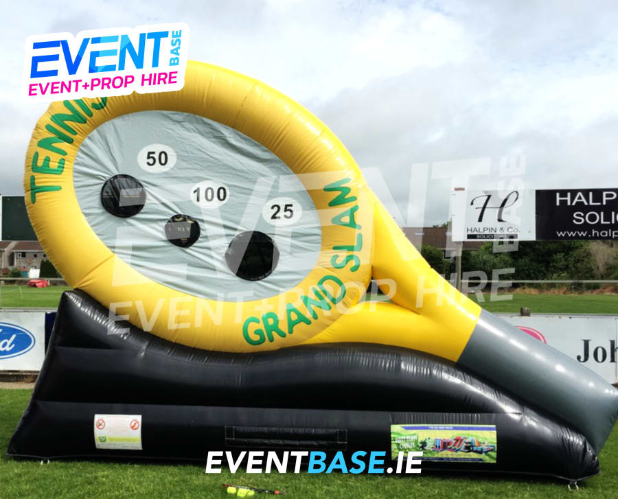 Description: 16ft(L) x 4ft(W) x 12ft(H) Giant Tennis Game. Try you hand at a game of tennis... no court required for this game. The aim of the game is to hit one of the targets and land the tennis ball in the net using the racket supplied. Contestants must aim to hit each of the three targets, scoring a maximum of 175 points if all targets are hit and the balls land in the nets. Great fun for all types of events and age groups. This game is exclusive to First Class Castles. As with all our Inflatable Games, an event operator may be provided for an additional fee, if required for your event.