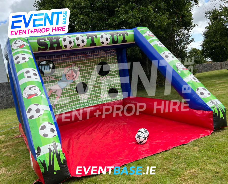 Description: 12ft(L) x 12ft(W) x 10ft(H) Inflatable Penalty Shootout Arena. Test your football skills with our cool ‘Penalty Shootout'. Designed for all you budding Torres, Ronaldo & Peles – our Football Shootout will get you into professional shape in no time. There are 4 different size holes to aim for, and we’ll give you a football to play with.Invite some friends round to your back garden, and challenge them for a shootout match. Or perhaps it’s your town fair or company party where the entire village / company can get a real competition on? Once successfully shot through, the footballs land in a zipped net behind which you can easily access - so you can play over and over again! Perfect for any team building event or simply a competitive fun carnival game side-show. Also available in Red & Blue.