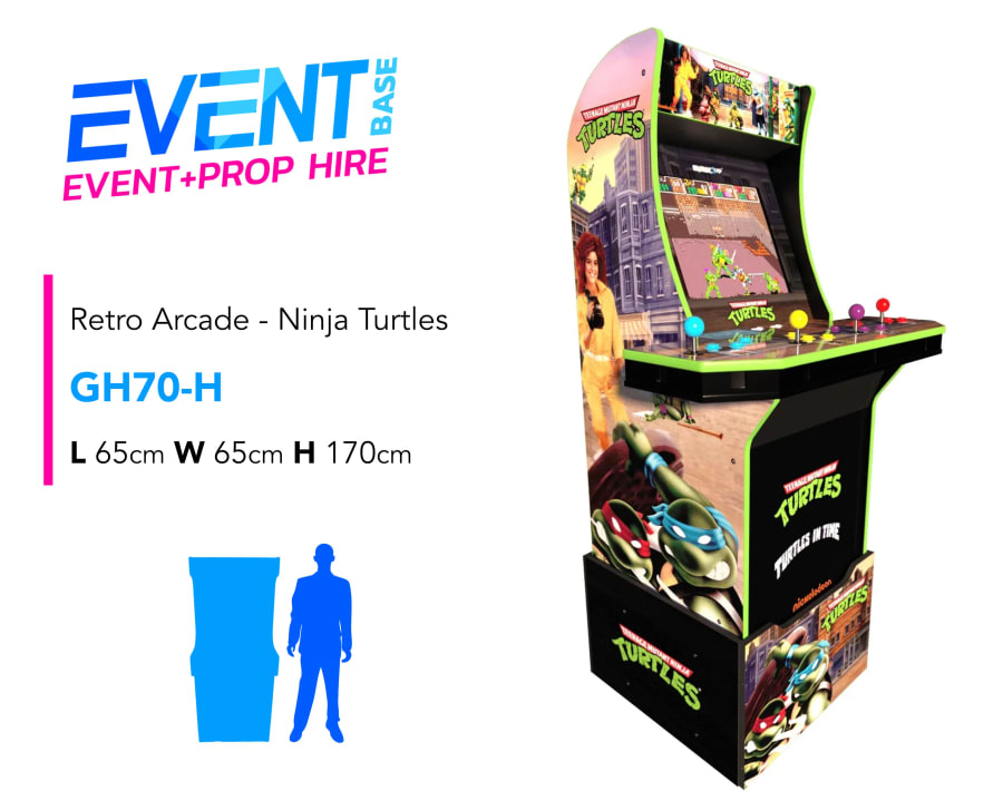 Description: EventBase are delighted to introduce our all new Retro Arcade Game Machine hire. Our game machines are preloaded with a Pandora Games System containing over 3,000 game options for your users to enjoy. The machines standing 5ft tall are visually striking with assorted retro game branding, looking fantastic at any event site. Our Retro Arcade Game machines are equipped with a 24" clear display screen, illuminated buttons and crisp sound. This game is fully branded with Ninja Turtles graphics & led light box.
