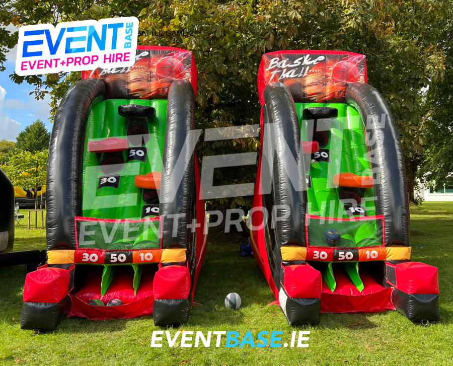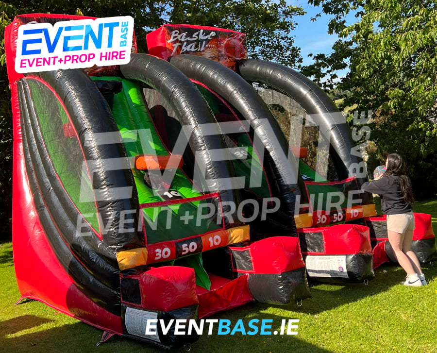 Description: 12ft(L) x 18ft(W) x 16ft(H) Basketball Hoops Game. Fancy something competitive? Hire our brand new Basketball Shoot. Boasting highly bright colours, single user game with triple target of ascending points is the perfect challenge. This inflatable basketball hire attraction is equipped with a ball return for ease of play. This game is effectively a double up of our single Basketball Target Shoot Game (to book simply book IG27 Twice!)