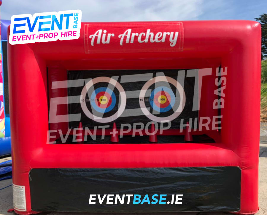 Description: Introducing "Air Archery", a much safer and more innovative version of the hugely popular traditional archery game. This game is one of EventBase's favourite games for both kids and adults alike. It comes supplied with two small crossbows and plastic arrows with suckers on the end as well as four plastic ball that are suspended in the air above air cones. If you don't want to use the crossbows then it can also be used as an inflatable coconut shy - using tennis balls to try and knock off the suspended balls . A really good game for adults to play alongside kids!
