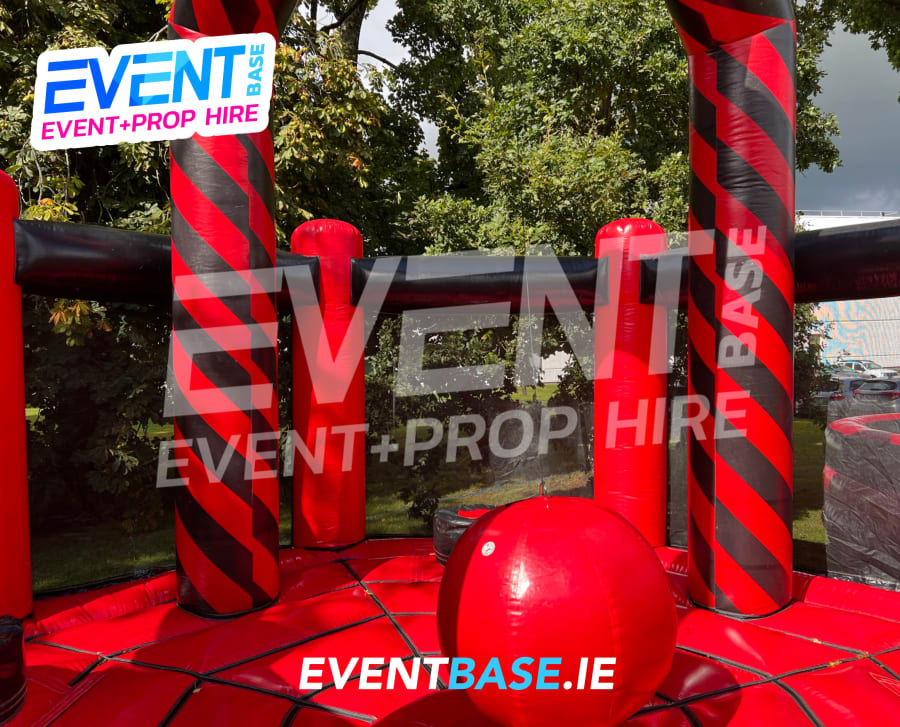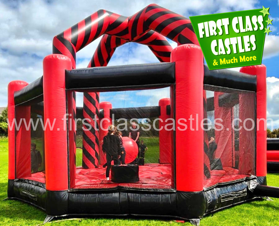 Description: Huge 20ft x 25ft Game, consists of a large inflatable bed with four raised woobly inflatable plinths. Our newer design is fully enclosed to protect from the Irish weather, but more importantly is really safe. The side walls are fully netted to enable spectators to watch from outside. The aim of the game is to knock your opponent off their plinth by pushing a suspended padded wrecking ball in their direction and to dodge the ball yourself when it comes back in order to become the last person standing. Great Fun for Kids Big and Small! This version is custom built and exclusive to First Class Castles.