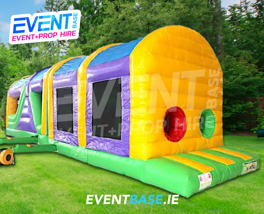 Description: Introducing the new model "Thriller" is a 45ft(L) x 15ft(W) x 15ft(H) Obstacle Course. The unit is fitted with safety netting on each side allowing ease of visibility and supervision for parents. The unit is a plain multicoloured unit, suitable for a variety of events, non-themed and non-branded as some customers prefer. The majority of this Obstacle Course is enclosed making it suitable for use even in showery weather. The course consists of a port-hole entrance, jump through area, tunnells, pop-up tubes and the all important slide to finish. This is a nice neutral multi-coloured design making it suitable for most age groups. Visually stunning... adults and kids alike will be impressed with this fun inflatable. This is a really popular product and availability is limited, call us today to secure your date. This Obstacle Course is also partially covered making it an ideal solution for the showery Irish weather.