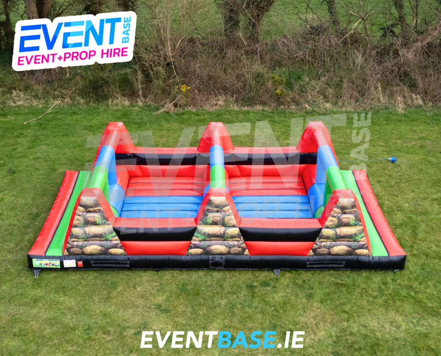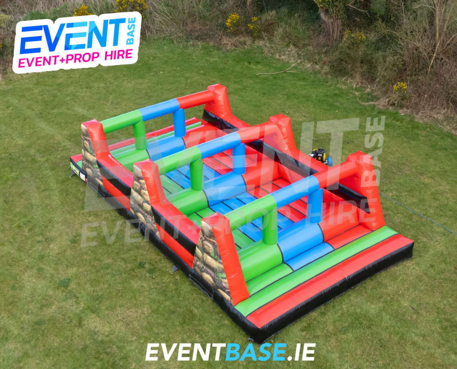 This incredible Obstacle Course Challenge compliments all our 'ULTIMATE WIPEOUT LIVE' Games. The full circuit is designed exclusively for us in a triple lane format with colour coded GREEN, BLUE & RED lanes. The idea behind this Obstacle Course design is that the sections are stand-aline individual pieces. These sections can then be set about as individual stations whereby participants run from one section / activity station to the next, perhaps with some smaller challenger in between! The options are endless! Having all pieces set across an event site or pitch really adds that 'WOW' factor to any event site. Make this incredible 5 Section Obstacle Course really 'POP' with our matching auxiliary games including; Vertical Climbing Wall, Warrior Wall, Gladiator Duel, Cliff Jump, Bungee Run, Interactive Shootout & many more...