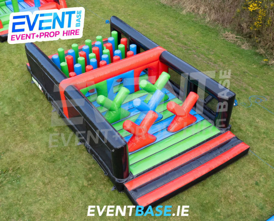 This incredible Obstacle Course Challenge compliments all our 'ULTIMATE WIPEOUT LIVE' Games. The full circuit is designed exclusively for us in a triple lane format with colour coded GREEN, BLUE & RED lanes. The idea behind this Obstacle Course design is that the sections are stand-aline individual pieces. These sections can then be set about as individual stations whereby participants run from one section / activity station to the next, perhaps with some smaller challenger in between! The options are endless! Having all pieces set across an event site or pitch really adds that 'WOW' factor to any event site. Make this incredible 5 Section Obstacle Course really 'POP' with our matching auxiliary games including; Vertical Climbing Wall, Warrior Wall, Gladiator Duel, Cliff Jump, Bungee Run, Interactive Shootout & many more...