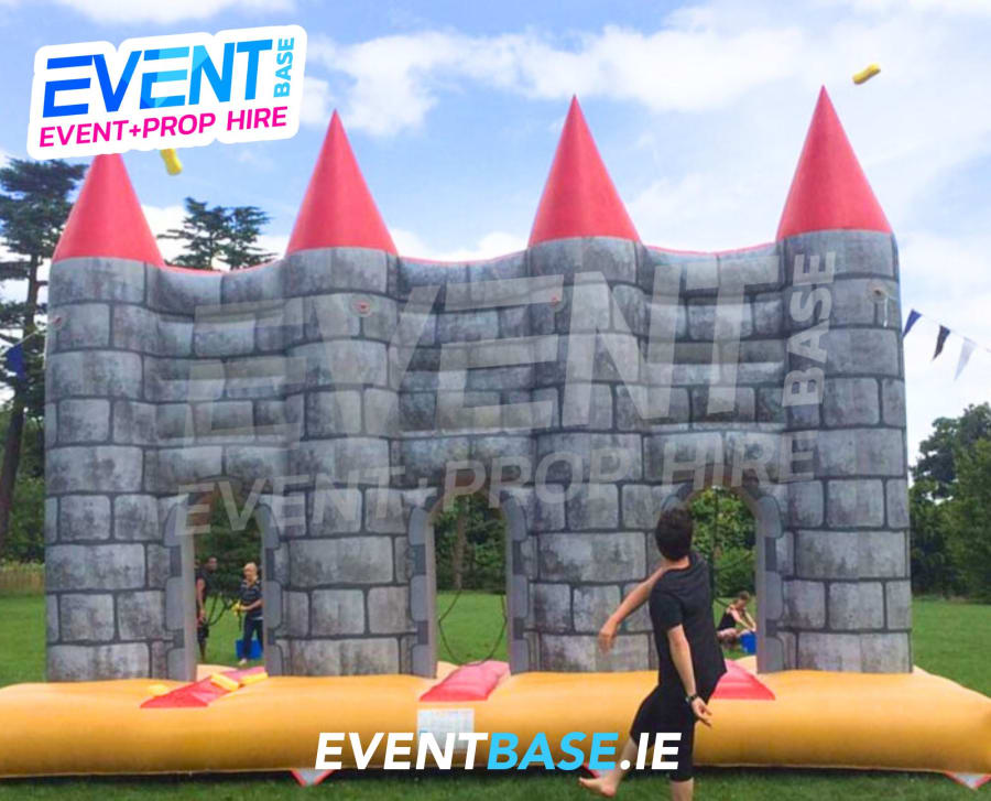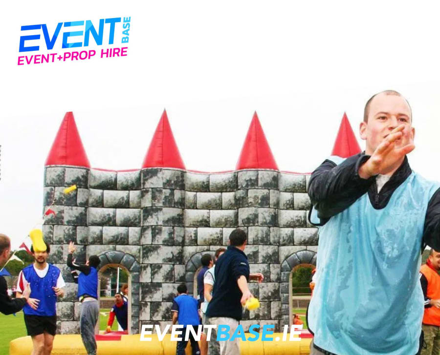 You’ll face off against a massive triple-arch inflatable castle wall, standing proud and ready to test your team’s agility, coordination, and sponge-hurling skills. Here’s how it works: