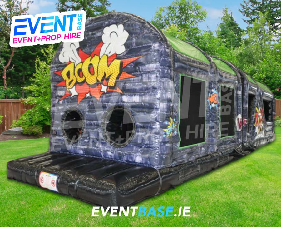 Description: The new model "Comic Challenger" is a 45ft(L) x 15ft(W) x 15ft(H) Obstacle Course. The unit is fitted with safety netting on each side allowing ease of visibility and supervision for parents. The Obstacle Course is fully enclosed making it suitable for use even in wet weather. The course consists of a port-hole entrance, jump through area, tunnells, pop-up tubes and the all important slide to finish. This is a nice neutral multi-coloured design making it suitable for most age groups. Visually stunning... adults and kids alike will be impressed with this fun inflatable. This is a really popular product and availability is limited, call us today to secure your date. Perfect for a Super Hero or Comic Book Theme Party!