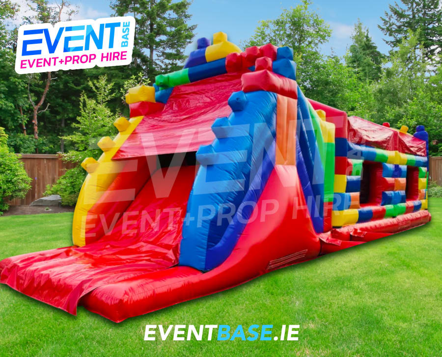 Description: Lego Brick or Build a Block style Themed Inflatable Obstacle / Assault Course Bouncy Castle for Hire. EventBase are pleased to present this all new inflatable obstacle course for hire measure in at whopping 42ft in length yet is still perfect for both indoor and outdoor hire. 42ft is a brilliant length making it suitable for most domestic parties, pubs, clubs, schools, fun-days, scouts, cubs, guides and other community groups aiming to keep children entertained for longer periods of time than the standard bouncy castle for example.