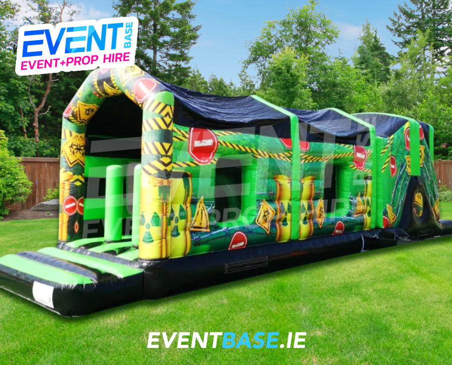 Description: Toxic Nuclear Waste Themed Inflatable Obstacle / Assault Course Bouncy Castle for Hire. EventBase are pleased to present this all new inflatable obstacle course for hire measure in at whopping 42ft in length yet is still perfect for both indoor and outdoor hire. 42ft is a brilliant length making it suitable for most domestic parties, pubs, clubs, schools, fun-days, scouts, cubs, guides and other community groups aiming to keep children entertained for longer periods of time than the standard bouncy castle for example.