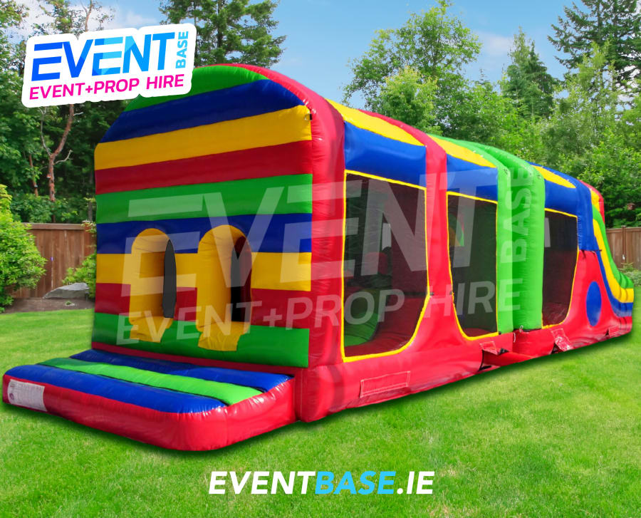 Description: The new model "Conquest" is a 45ft(L) x 15ft(W) x 15ft(H) Obstacle Course. The unit is fitted with safety netting on each side allowing ease of visibility and supervision for parents. The Obstacle Course is fully enclosed making it suitable for use even in wet weather. The course consists of a port-hole entrance, jump through area, tunnells, pop-up tubes and the all important slide to finish. This is a nice neutral multi-coloured design making it suitable for most age groups. Visually stunning... adults and kids alike will be impressed with this fun inflatable. This is a really popular product and availability is limited, call us today to secure your date.