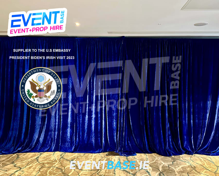 The backdrop itself is installed on a telescopic Pipe & Drape framework (hired separately). Each drape panel is fitted with a tab top pole pocket allowing the crossbar to slide through the drape panel. The cross bars then slot into the upright poles which are affixed to the heavy base plates.