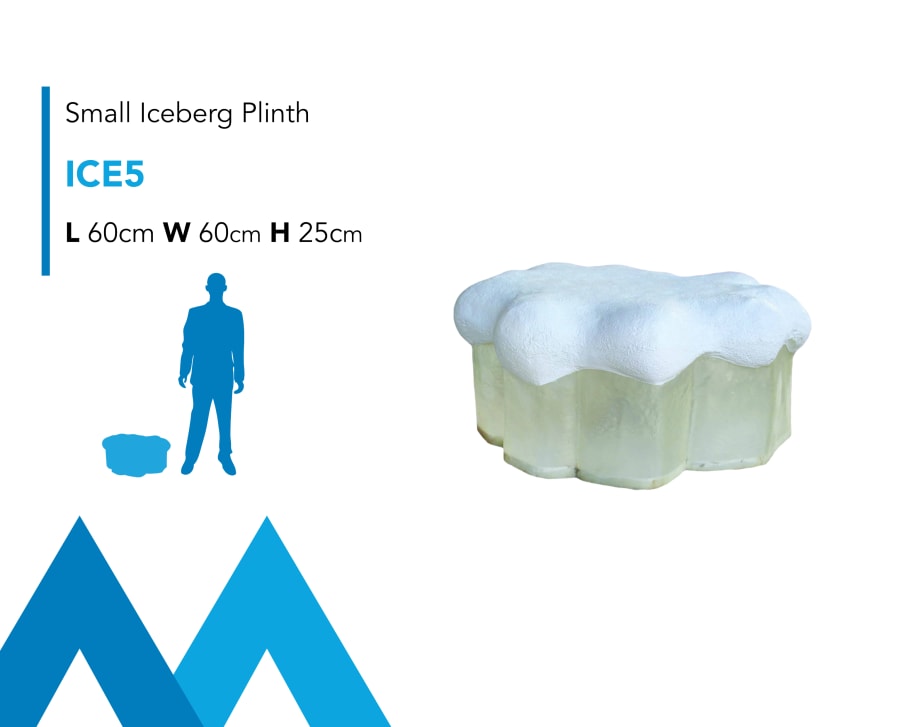 Description: This fantastic Giant Iceberg Plinth Prop is an ideal model for Polar, Ice Cave, Winter, Ski Slope or Snow themed areas. This is a great poly-resin moulded unit treated with a snow capped effect. The base is produced from clear fibreglass allowing uplighters to filter through. These plinths are the perfect base for our Winter Character props or as a standalone hire prop.