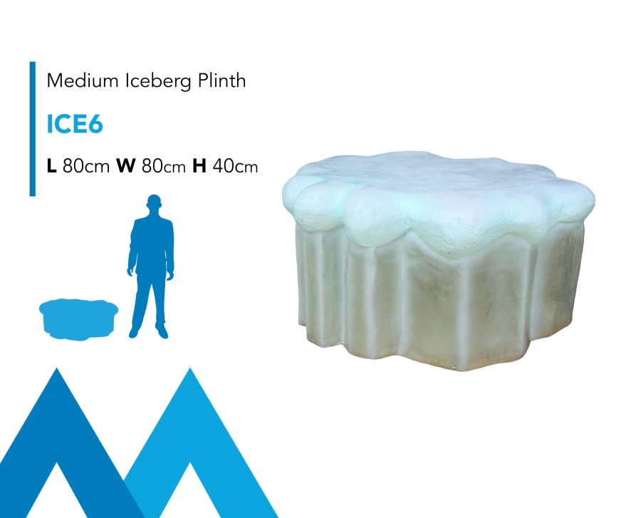 Description: This fantastic Giant Iceberg Plinth Prop is an ideal model for Polar, Ice Cave, Winter, Ski Slope or Snow themed areas. This is a great poly-resin moulded unit treated with a snow capped effect. The base is produced from clear fibreglass allowing uplighters to filter through. These plinths are the perfect base for our Winter Character props or as a standalone hire prop.