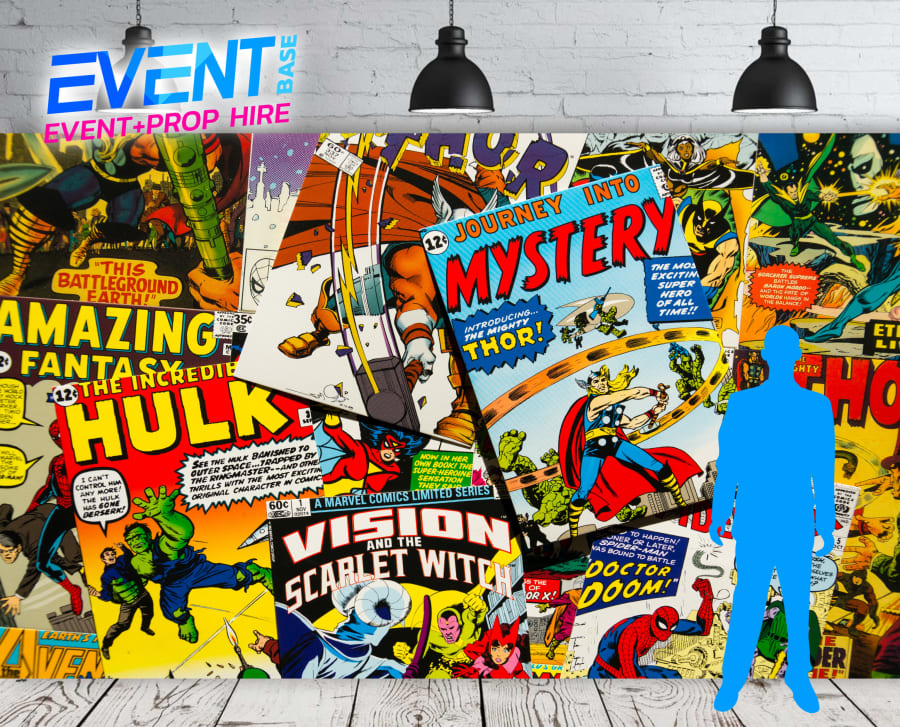 Description: This unique Retro / Classic Comic Book print backdrop, is like the inside of an 80's School Bag! Printed with all the classics comic book cover designs. These large screens are self supporting and are usually placed as wall coverings or self-standing units to form a realistic themed effect. Our backdrops are digitally printed on high anti-wrinkle fabric material providing a flawless effect and are installed on a Pipe & Drape framework (included). They are mainly used to form a Backdrop to Event Displays, for Photo Opportunities, Parties, Corporate Events & to decorate rooms, banquet halls. Custom designs also available, call us to discuss your requirements.