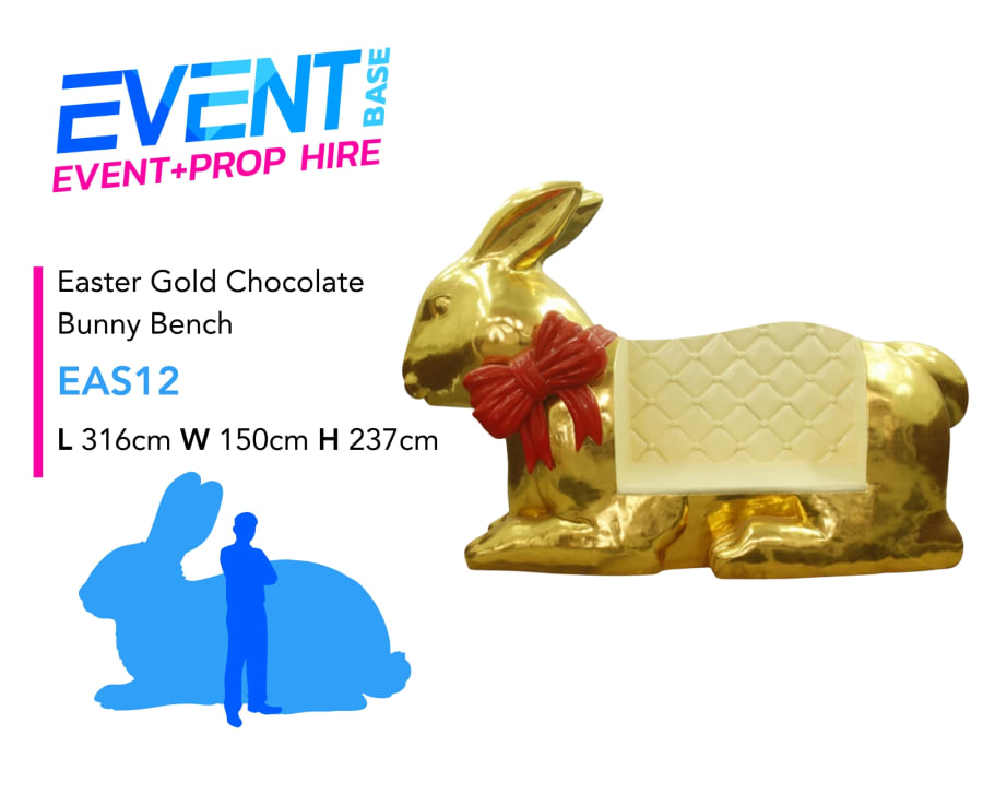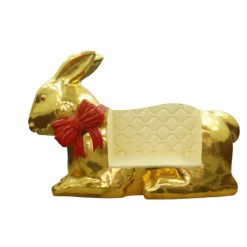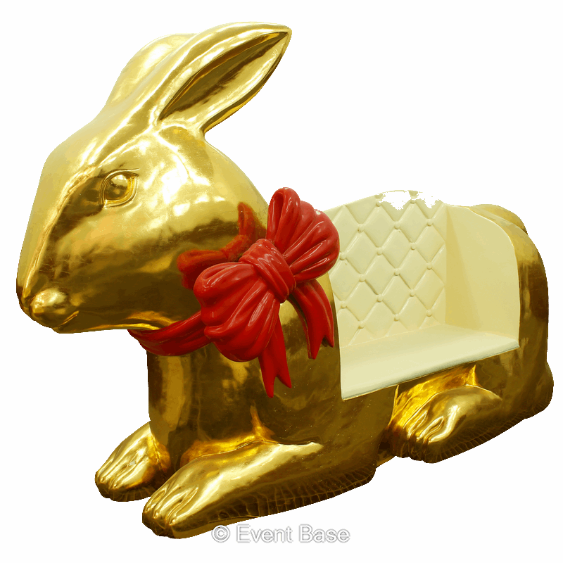 Beautifully crafted in a glossy gold style and finished with a decorative bow and quilted-effect seating area, this unique prop doubles as both a functional bench and an interactive photo opportunity. Guests can sit alongside the bunny for memorable pictures, making it ideal for shopping centres, retail activations, hotels, corporate events, Easter Bunny meet & greets and visitor attractions.