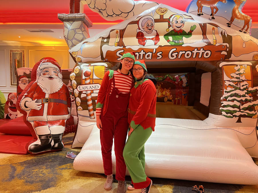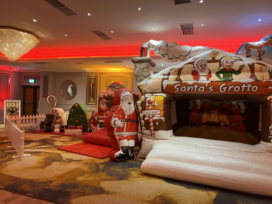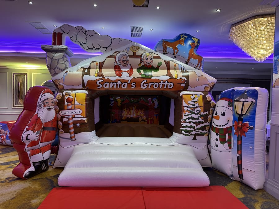 Description: 15ft(L) X 19ft(W) X 10ft(H) Incredible Christmas themed Bouncy Castle with inflatable characters to the side. This bouncy castle also has a retaining wall to the front for safety and also to hold softplay balls acting as an inflatable ballpool if required. Visually stunning log cabin design, a perfect compliment to our inflatable log cabin grottos. This castle is designed to keep the slide and castle covered in the event of bad weather. Can also be used indoors, fits comfortable beneath a standard 10ft ceiling height.