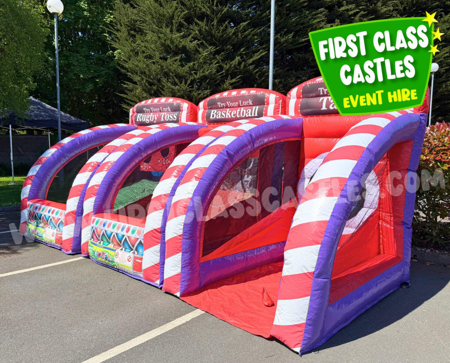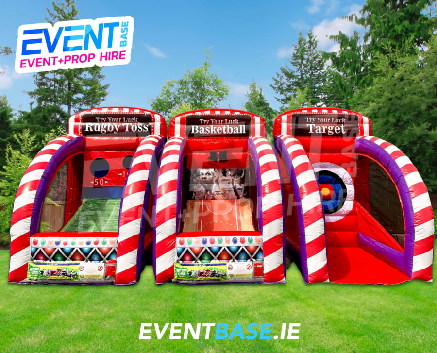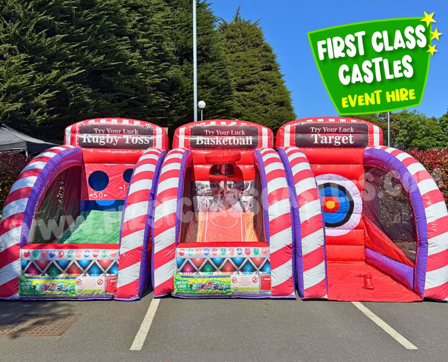Our inflatable stall combines three exciting games in one impressive unit, with three distinct walk-up booths: