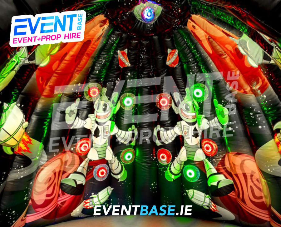 Description: The long awaited Interactive Play Dome offers 3 different game-modes! This truly amazing system tests one’s endurance, hand-eye coordination and teamwork. We made it wireless, safe, user friendly and mobile. The Interactive Play Dome is our new take on the hugely popular Bakak or Batak Pro Reaction wall version. Our Interactive Play Dome game is a cool space age 3D Inflatable Dome with animated Cyborg print internally. The game can accommodate multiple players at once, making it a much competitive and team building friendly activity. It consists of 10 wireless sensors fixed to the table structure, a score display/panel, which is integrated in a solid free-standing case which is set up beside the table displaying participants sores. Both the case with display and the sensors will remain charged for 1-2 days, even if they’re being used the entire time! The sensors work on a 2,4 Ghz frequency, so no WIFI is needed. The range of the sensors is 60-70 ft. This game can be played in three unique ways as follows: